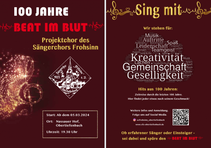 Jubelt mit uns 100 Jahre voller Beats, Melodien und unvergesslicher Moments! 🎉 Zum großen Jubiläum laden wir euch herzlich ein, Teil unseres coolen Projektchors „BEAT im BLUT“ zu werden – eine wilde Zeitreise durch die letzten 100 Jahre Musikgeschichte. 🚀
